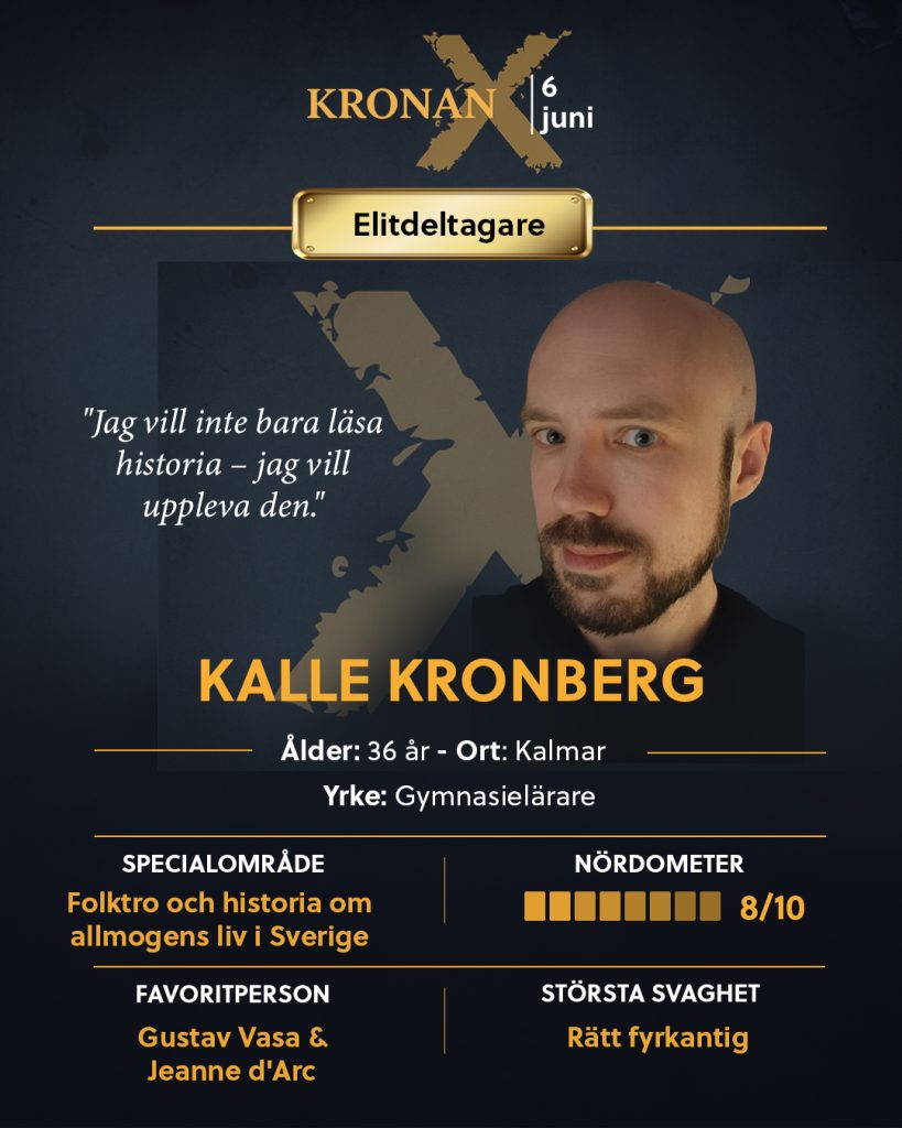 Som en del av vinnarlaget Kalabaliken i Bender i Kalmar läns museums historiequiz (säsong 25/26) tog han hem en av platserna i elitfältet. Det gör honom till en deltagare som redan har bevisat att han kan leverera när det gäller.